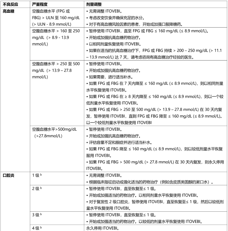 表 2 总结了针对不良反应的 ITOVEBI 剂量调整建议。